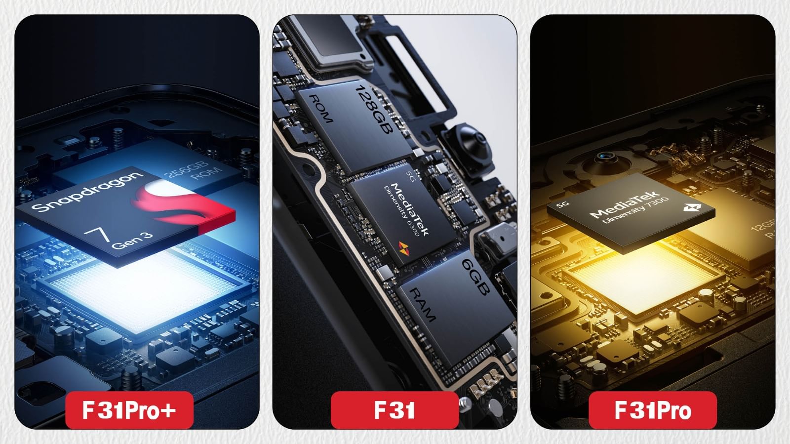 OPPO F31 Pro 5G में MediaTek Dimensity 7300 Energy जैसा शक्तिशाली चिपसेट है। यह एक 4nm फ्लैगशिप प्रोसेसर है जिसमें 8-कोर ARM CPU और ARM Mali GPU है। इसमें AI NPU 655 भी है, जो 20% बेहतर एनर्जी एफिशिएंसी और 20% तेज FPS प्रदान करता है। FPS ने सिस्टम में होने वाली देरी को कम किया और तेज प्रतिक्रियाएं दीं, जिससे गेमिंग का मजा बढ़ गया। फोन गर्म नहीं होता क्योंकि इसमें 4,363 mm² का SuperCool VC System है, जो 45°C में भी स्थिर रहता है। दूसरी ओर, OPPO F31 5G में MediaTek Dimensity 6300 Energy है, जो एक 6nm फ्लैगशिप चिप है। इसमें 11% बेहतर एनर्जी एफिशिएंसी और 13% तेज FPS मिलता है।