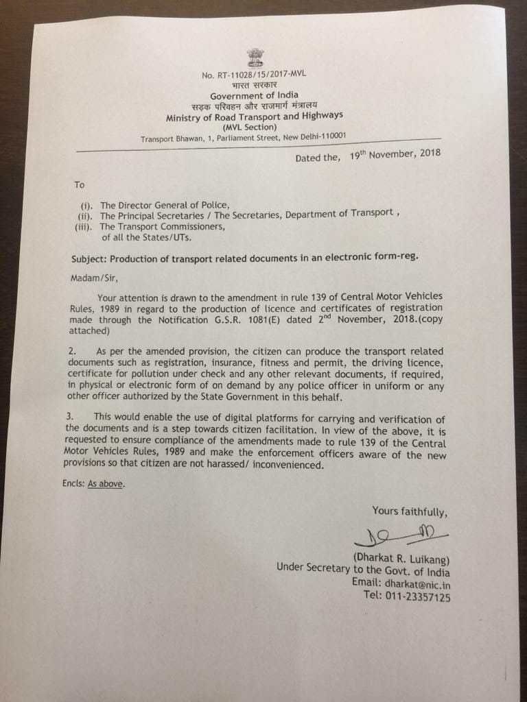 केन्द्रीय मोटर व्हीकल एक्ट के नियम 139 के तहत इस संशोधन को पारित किया गया है।जिसे लेकर सरकार ने नोटिफिकेशन भी जारी कर दिया है। यानि अब आपके पास अगर गाड़ी से जुड़े कागजात की सिर्फ इलेक्ट्रिानिक कॉपी है तो आपको पहले की तरह किसी तरह का चालान नहीं भरना पड़ेगा।