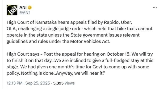कर्नाटक हाईकोर्ट में सोमवार को रैपिडो, उबर और ओला जैसी कैब एग्रीगेटर कंपनियों की अपीलों पर सुनवाई हुई। ये अपीलें उस सिंगल जज बेंच के आदेश को चुनौती देती हैं, जिसमें कहा गया था कि राज्य सरकार जब तक मोटर व्हीकल एक्ट के तहत गाइडलाइन और नियम नहीं बनाती, तब तक बाइक टैक्सियां कर्नाटक में नहीं चल सकतीं।