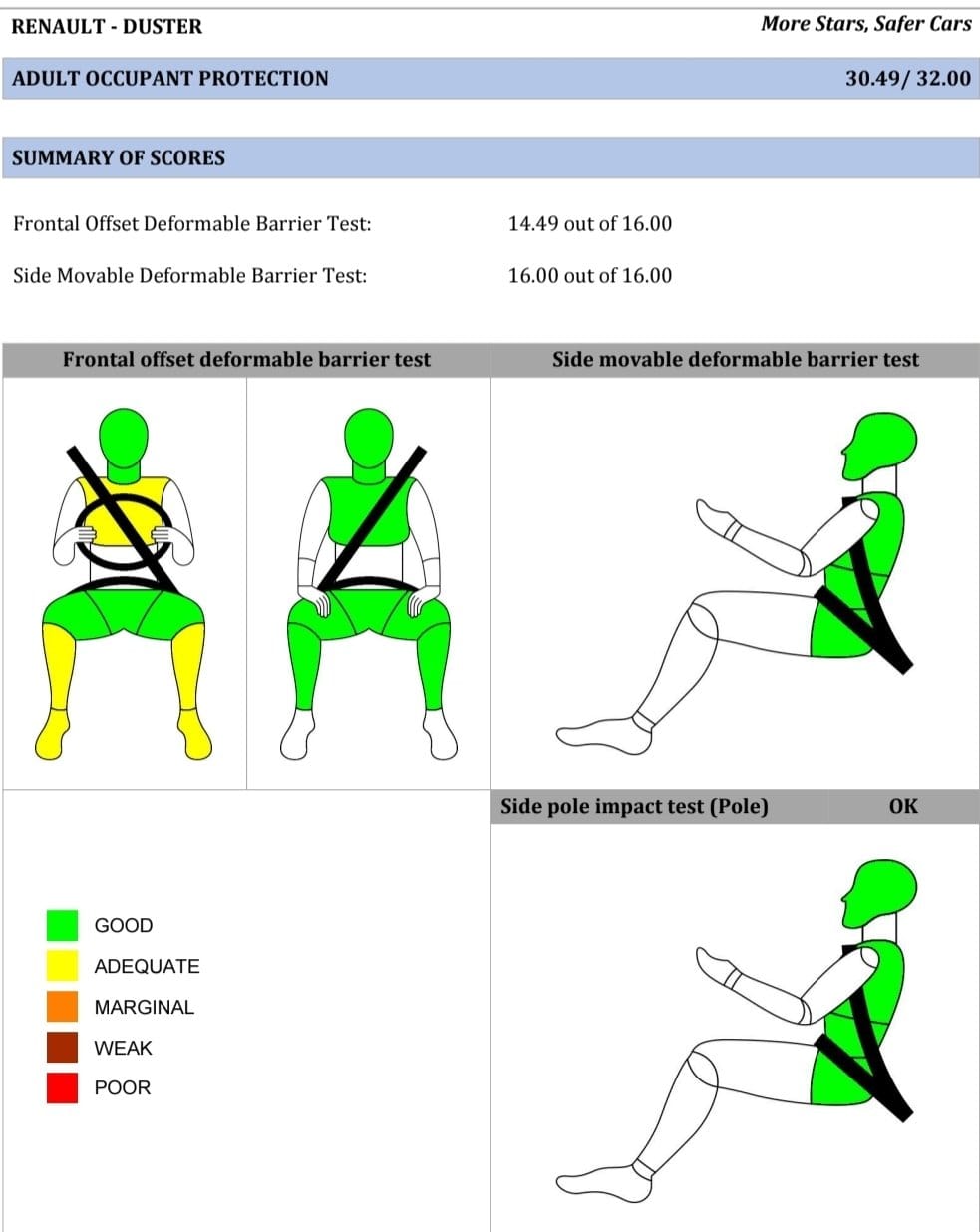 सुरक्षा का यह स्तर सिर्फ ढांचे तक ही सीमित नहीं है। टेस्ट के नतीजों से साफ हुआ है कि हादसे के वक्त यह गाड़ी सिर, गर्दन और छाती जैसे शरीर के बेहद नाजुक अंगों को 'बेहतरीन' सुरक्षा देने में सक्षम है। चाहे सामने से होने वाली टक्कर हो या बगल से होने वाली भिड़ंत, डस्टर ने दोनों ही चुनौतीपूर्ण स्थितियों में यात्रियों को सुरक्षित रखकर अपनी मजबूती का लोहा मनवाया है।