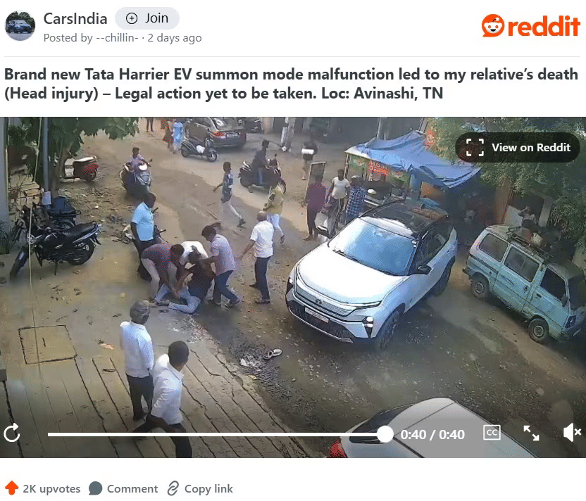 तमिलनाडु में Tata Harrier EV (टाटा हैरियर ईवी) के Summon Mode (समन मोड) से जुड़ा एक गंभीर हादसा सामने आया है। इस हादसे में एक शख्स की जान चली गई। इसके बाद टाटा मोटर्स ने आधिकारिक बयान जारी किया है। कंपनी ने अपनी आधिकारिक प्रतिक्रिया में कहा कि वह इस नुकसान से "बहुत दुखी" है और मृतक के परिवार के प्रति अपनी संवेदना, प्रार्थना और हार्दिक समर्थन व्यक्त करती है।