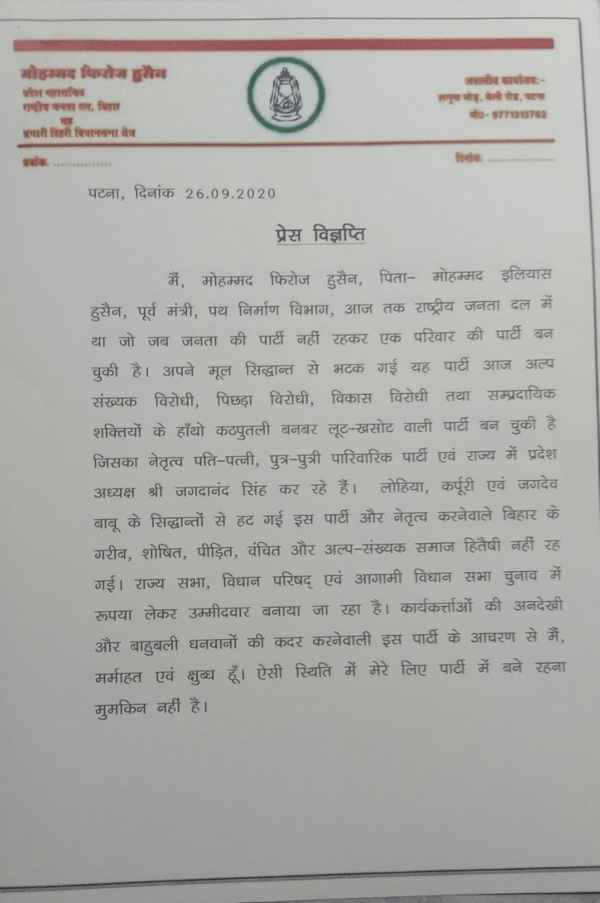 Bihar: Rashtriya Janata Dal (RJD) state General Secretary Mohammed Firoz Hussain gives up primary membership of the party.