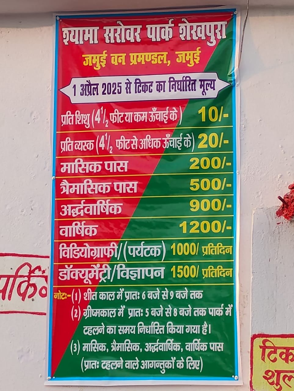 शेखपुरा शहर के लोकप्रिय श्यामा सरोवर पार्क में अब मुफ्त प्रवेश पूरी तरह से बंद कर दिया गया है। एक अप्रैल से लागू हुए नए नियम के तहत पार्क में प्रवेश करने के लिए हर व्यक्ति को शुल्क देना होगा। यह निर्णय वन विभाग द्वारा लिया गया है, जिससे मॉर्निंग वॉक करने वाले लोगों में नाराजगी देखी जा रही है। वन विभाग ने पार्क के मुख्य गेट पर प्रवेश शुल्क से संबंधित एक रेट चार्ट लगाया है। उसमें स्पष्ट किया गया है कि अब प्रत्येक व्यक्ति को 20 रुपये और बच्चों को 10 रुपये शुल्क देना होगा।