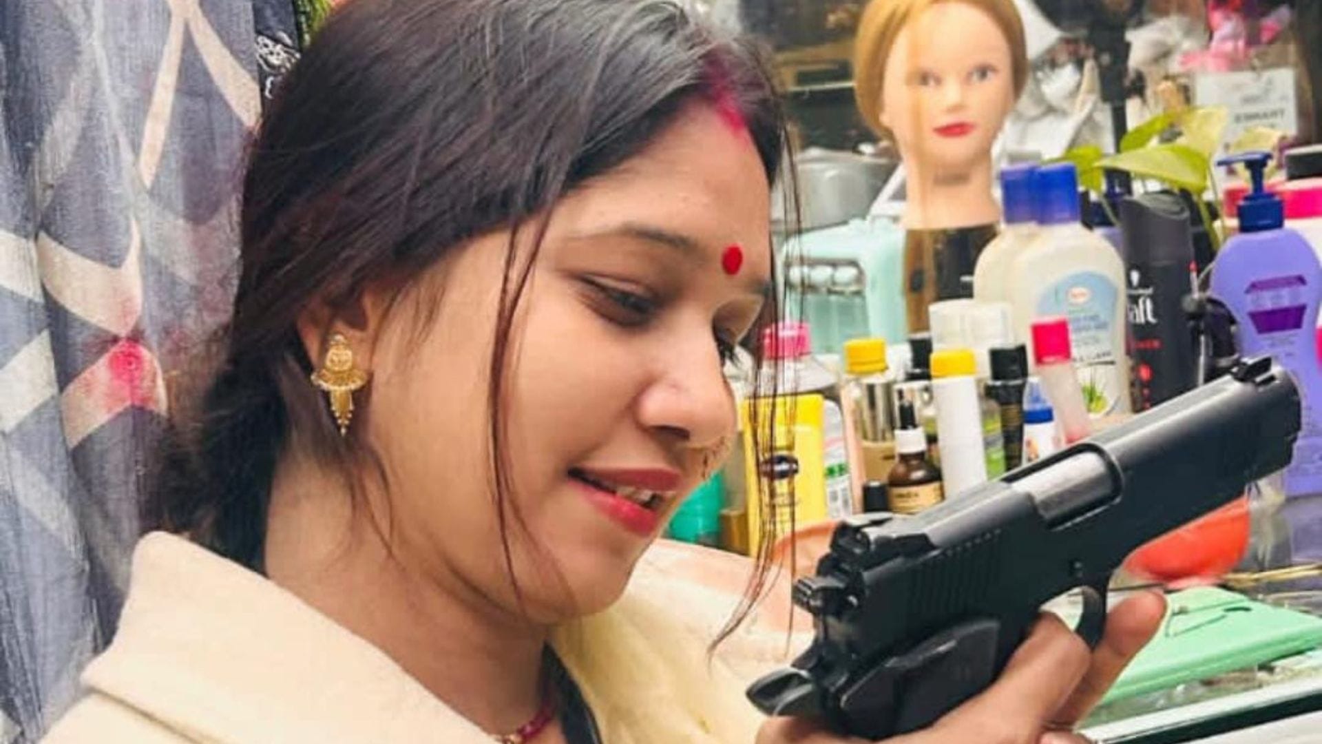 वहीं, वायरल हो रही तस्वीरों में महिला किसी ब्यूटी पार्लर में पिस्टल के साथ फोटो खिंचवाती हुई भी नजर आ रही है। इन तस्वीरों के वायरल होने के बाद पुलिस ने मामले में संज्ञान लिया।