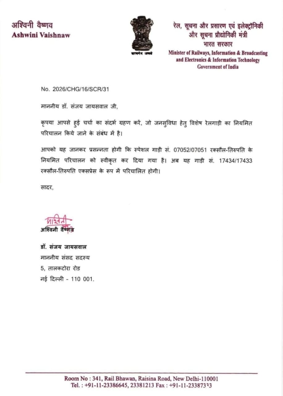 Bihar: बिहार के रक्सौल से तिरुपति के लिए नई नियमित एक्सप्रेस ट्रेन सेवा को मंजूरी मिलने से सीमावर्ती क्षेत्रों के यात्रियों को बड़ी राहत मिली है। अब सीधे कनेक्शन से यात्रा आसान होगी और समय व खर्च दोनों की बचत होगी।