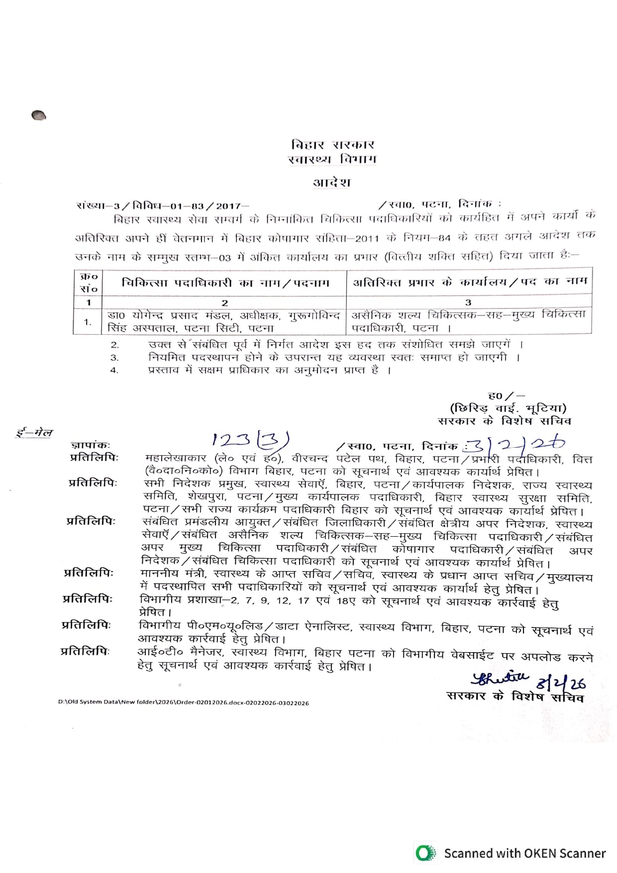स्वास्थ्य विभाग द्वारा 3 फरवरी की देर शाम जारी अधिसूचना में गुरु गोविंद सिंह अस्पताल के अधीक्षक डॉ. योगेन्द्र प्रसाद मंडल को वित्तीय शक्तियों सहित पटना का सिविल सर्जन बनाए जाने की जानकारी दी गई। आदेश में यह भी उल्लेख किया गया है कि यह नियुक्ति अगले आदेश तक प्रभावी रहेगी।