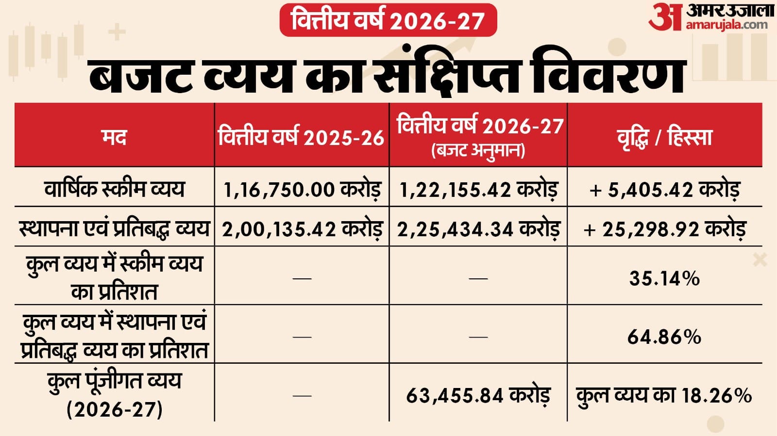 वित्तीय वर्ष 2026-27 में बिहार राज्य का बजट आकार 3,47,589.76 करोड़ रुपये है, जो वित्तीय वर्ष 2025-26 के बजट 3,16,895.02 करोड़ रुपये से 30,694.74 करोड़ रुपये अधिक है। इस वर्ष वार्षिक स्कीम का बजट अनुमान 1,22,155.42 करोड़ रुपये रखा गया है, जो पिछले वर्ष के 1,16,750 करोड़ रुपये से 5,405.42 करोड़ रुपये अधिक है। वहीं, स्थापना और प्रतिबद्ध व्यय का बजट अनुमान 2,25,434.34 करोड़ रुपये है, जो वित्तीय वर्ष 2025-26 के 2,00,135.42 करोड़ रुपये से 25,298.92 करोड़ रुपये अधिक है। कुल व्यय में स्कीम व्यय का हिस्सा 35.14 प्रतिशत जबकि स्थापना और प्रतिबद्ध व्यय का हिस्सा 64.86 प्रतिशत है। साथ ही, वित्तीय वर्ष 2026-27 में कुल पूंजीगत व्यय 63,455.84 करोड़ रुपये अनुमानित किया गया है, जो कुल व्यय का 18.26 प्रतिशत बनता है।