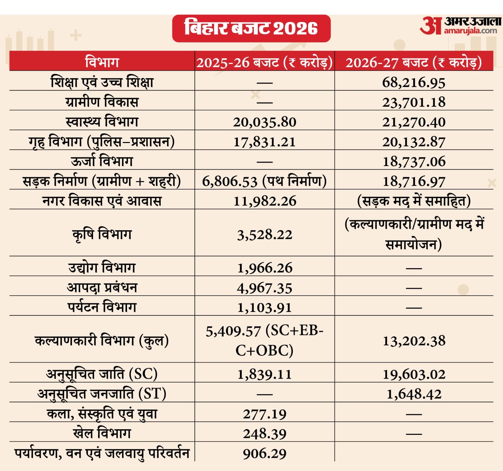 बिहार सरकार के वित्त मंत्री बिजेंद्र प्रसाद ने 3 फरवरी को 2026-27 का बजट पेश किया, जिसकी कुल राशि 3,47,589 करोड़ रुपये है, जो पिछले बजट से लगभग 21 हजार करोड़ ज्यादा है।