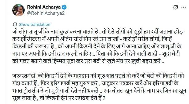 रोहिणी आचार्य ने कहा कि जो लोग लालू जी के नाम पर कुछ करना चाहते हैं, उन्हें झूठी हमदर्दी जताने के बजाय हॉस्पिटल में अपनी अंतिम सांसे गिन रहे उन लाखों-करोड़ों गरीब लोगों, जिन्हें किडनी की जरूरत है, उन्हें अपनी किडनी देने के लिए आगे आना चाहिए और लालू जी के नाम पर किडनी दान करनी चाहिए।