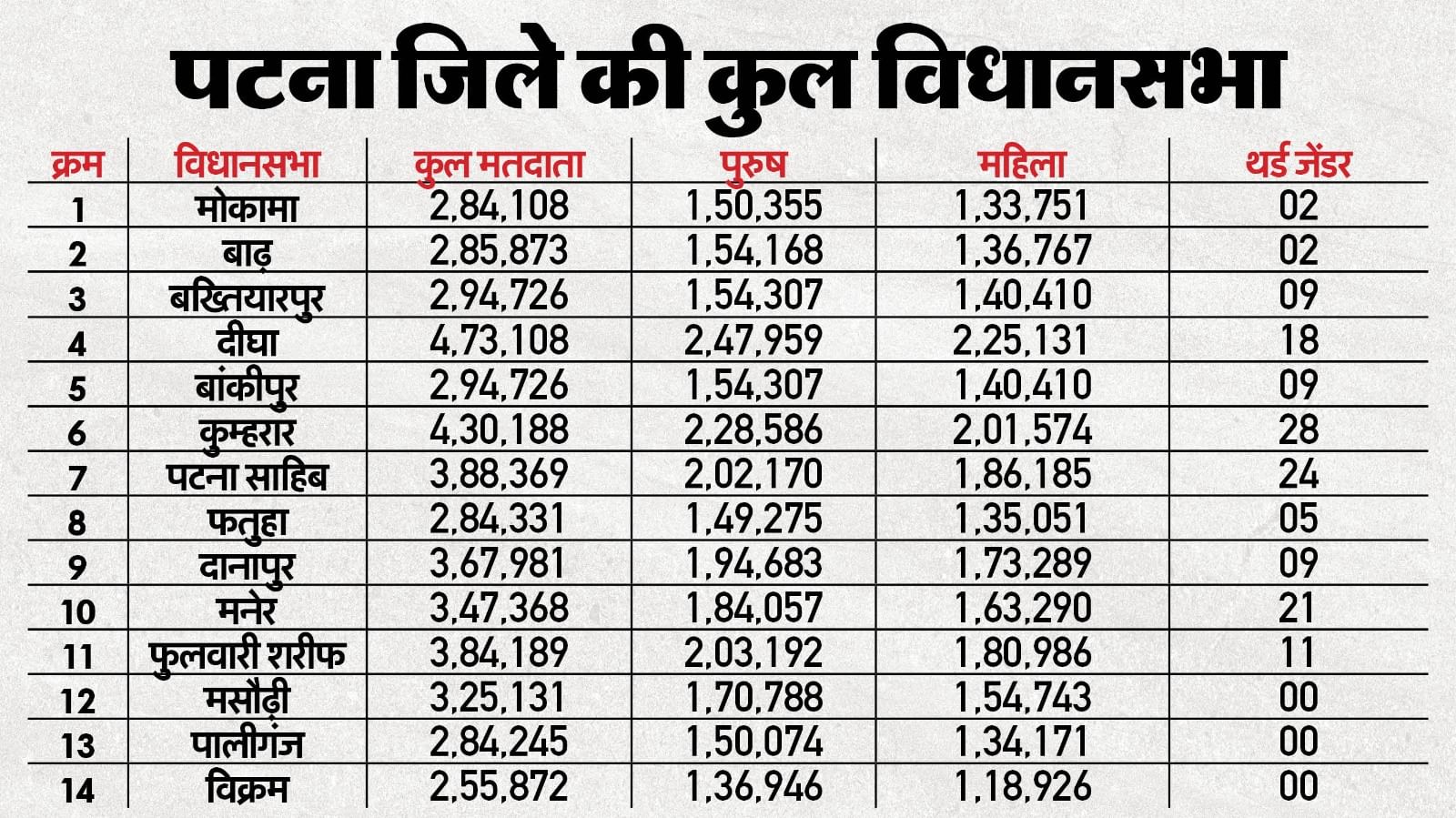 बिहार के 38 जिलों में से सर्वाधिक 14 विधानसभा क्षेत्रों वाला पटना जिला है। राजधानी तो है ही। राजधानी पटना क्षेत्र में बांकीपुर, कुम्हरार, दीघा और पटना साहिब विधानसभा क्षेत्र हैं। बाकी, एक तरफ फुलवारीशरीफ, दानापुर, मनेर, बिक्रम, पालीगंज और मसौढ़ी विधानसभा क्षेत्र हैं। दूसरी तरफ, फतुहा, बख्तियारपुर, बाढ़ और मोकामा विधानसभा क्षेत्र हैं। मोकामा का कुछ हिस्सा मुंगेर लोकसभा क्षेत्र में आता है। मतदाता सूची के अनुसार, पटना जिले में कुल 48,15,294 मतदाता हैं। इनमें से 25,955 मतदाता पहली बार मतदान करने के लिए विशेष गहन पुनरीक्षण के दौरान जुड़े हैं।