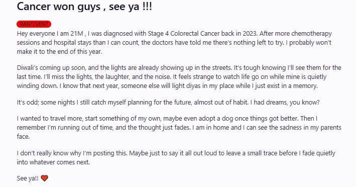 कभी-कभी जिंदगी इतनी मुश्किल हो जाती है कि शब्द भी छोटे पड़ जाते हैं। इंटरनेट पर इन दिनों एक ऐसे ही 21 साल के युवक की पोस्ट वायरल है, जिसे पढ़कर हर किसी की आंखें भर आ रही हैं। इस युवक को स्टेज 4 कोलोरेक्टल कैंसर है और डॉक्टर ने साफ कह दिया है कि अब उसके पास ज्यादा वक्त नहीं बचा। शायद यही वजह है कि उसने रेडिट पर लिखा, “कैंसर जीत गया दोस्तों, फिर मिलेंगे।” आइए जानते हैं कि शख्स ने और क्या लिखा है।