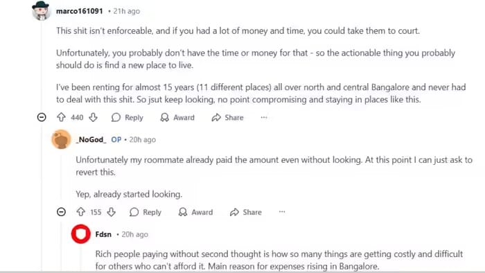 रेडिट पर पोस्ट करने वाले शख्स ने यह सवाल उठाया कि आखिर यह भेदभाव क्यों? वह भी उतना ही किराया, उतनी ही मेंटेनेंस और उतने ही चार्जेज देता है जितना कोई फैमिली। फिर बैचलर्स के लिए अलग नियम बनाना कहां तक सही है? उसने लिखा कि भले ही मामला देखने में छोटा लगे, लेकिन सोसायटी का यह रवैया बिल्कुल ठीक नहीं है। यूजर इस फाइन के खिलाफ एक्शन लेने की सोच रहा है। उसका कहना है कि ऐसे नियम लोगों की प्राइवेसी और स्वतंत्रता दोनों पर असर डालते हैं। हर किसी को यह अधिकार है कि वह अपने घर में किसे बुलाए और किसे रात में रुकने दे। सोसायटी का इस तरह दखल देना गलत है।