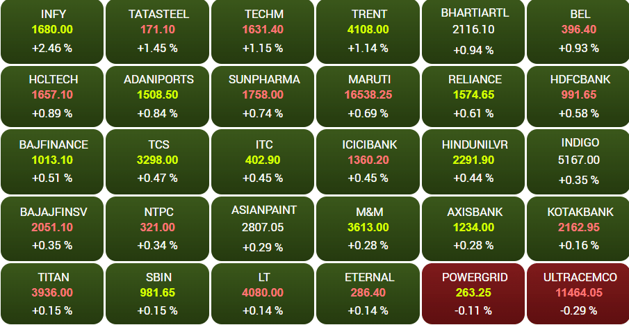 भारतीय बाजार सोमवार को बढ़त के साथ खुला। शुरुआती कारोबार में 30 शेयरों वाला सेंसेक्स 9:19 तक 383.49 अंक या 0.45 प्रतिशत बढ़कर 85,321.85 अंक पर आ गया। वहीं 50 शेयरों वाला निफ्टी 142.35 अंक या 0.55 प्रतिशत बढ़कर 26,108.75 अंक पर आ गया। शुरुआती कारोबार में रुपया अमेरिकी डॉलर के मुकाबले 22 पैसे बढ़कर 89.45 पर पहुंच गया।