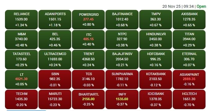 वैश्विक शेयर बाजारों में तेजी के साथ गुरुवार को शुरुआती कारोबार में सेंसेक्स और निफ्टी में तेजी देखी गई। ताजा विदेशी पूंजी प्रवाह से भी आशावादी रुख को बल मिला। शुरुआती कारोबार में 30 शेयरों वाला बीएसई सेंसेक्स 284.49 अंक चढ़कर 52 सप्ताह के उच्चतम स्तर 85,470.96 पर पहुंच गया। 50 शेयरों वाला एनएसई निफ्टी 83.35 अंक चढ़कर 52 सप्ताह के उच्चतम स्तर 26,136 पर पहुंच गया। अमेरिकी डॉलर में सुधार के कारण घरेलू मुद्रा में तेजी पर अंकुश लगने से रुपया 18 पैसे गिरकर 88.66 रुपये प्रति डॉलर पर आ गया।