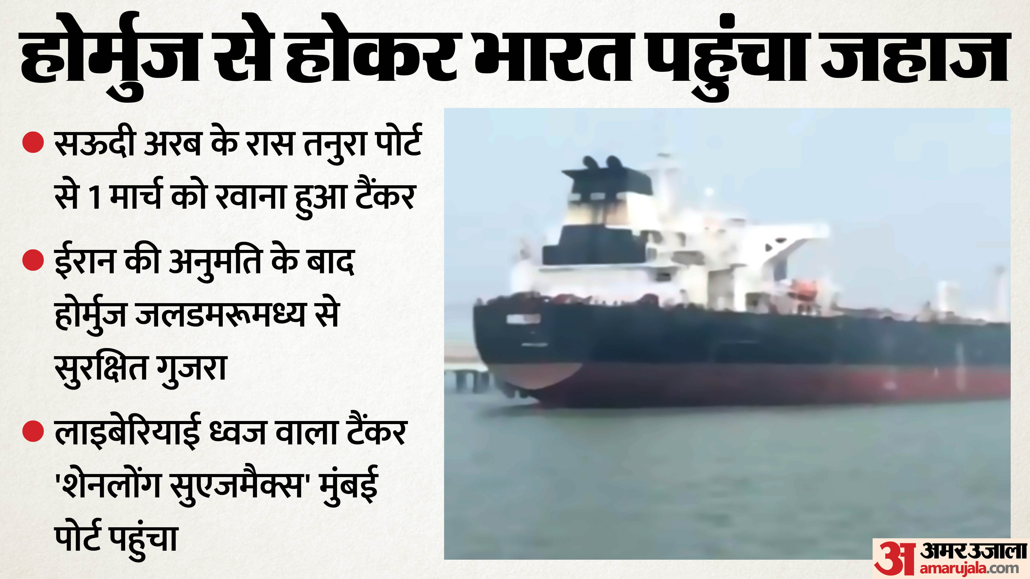 पश्चिम एशिया में बढ़ते तनाव के बीच एक लाइबेरियाई ध्वज वाला कच्चे तेल का टैंकर, जिसकी कमान एक भारतीय कप्तान के हाथ में थी, रणनीतिक रूप से अहम होर्मुज जलडमरूमध्य को पार कर सुरक्षित रूप से मुंबई बंदरगाह पहुंच गया। समाचार एजेंसी एएनआई के अनुसार यह टैंकर सऊदी अरब के रास तनुरा बंदरगाह से कच्चा तेल लेकर आया था।