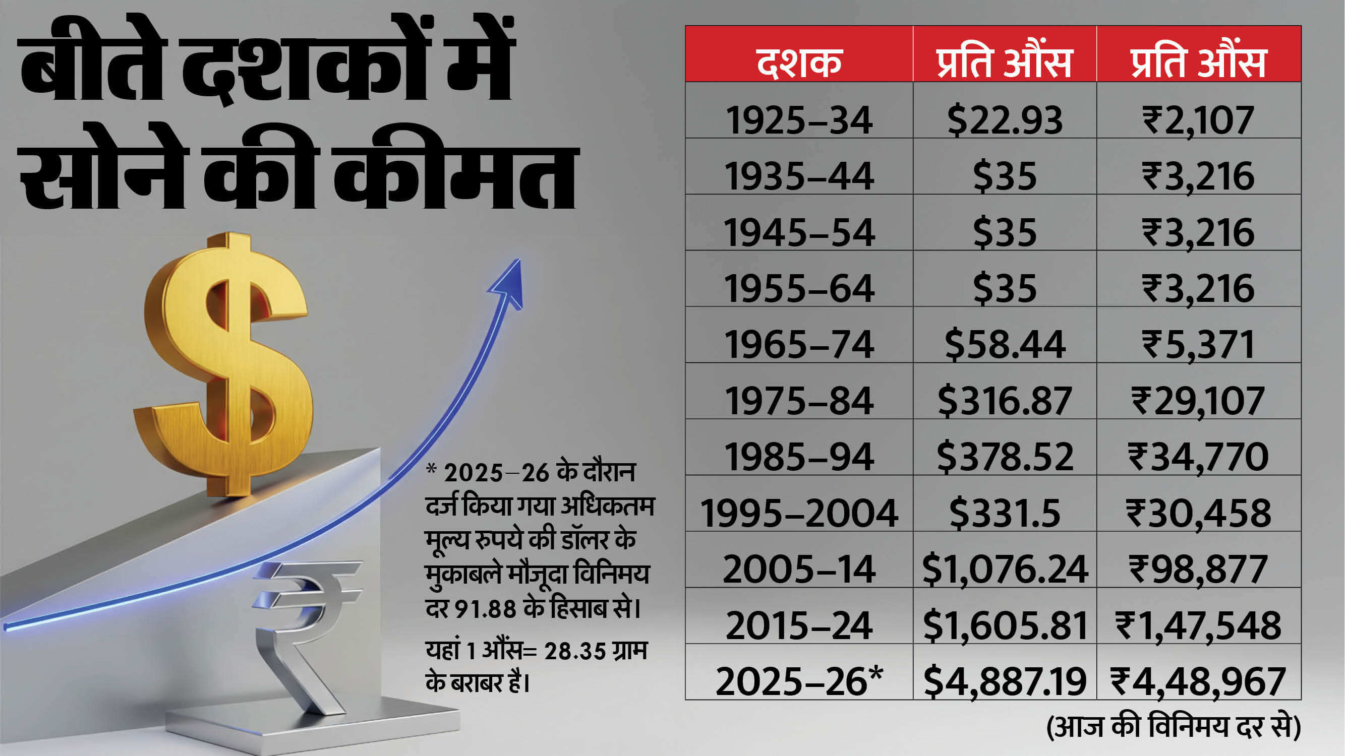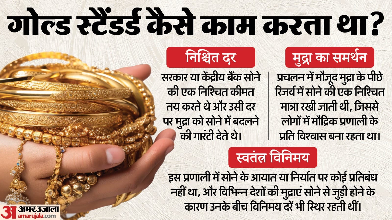 1717: गोल्ड स्टैंडर्ड युग की शुरुआत हुई, जब ब्रिटेन ने स्वर्ण को मानक बनाया। इसके साथ ही मुद्रा का मूल्य सोने की एक निश्चित मात्रा से जुड़ गया। यह एक ऐसी मौद्रिक प्रणाली थी, जिसमें किसी देश की मुद्रा का मूल्य उसके पास मौजूद सोने की निश्चित मात्रा से सीधे जुड़ा होता था। इसमें कागजी मुद्रा या सिक्कों को देश के रिजर्व में रखे गए भौतिक सोने द्वारा समर्थित किया जाता था, जिसका अर्थ था कि मुद्रा की प्रत्येक इकाई का एक ठोस मूल्य था। इसे चीन को छोड़कर लगभग पूरी दुनिया ने अपनाया।1870-1900: सोने के मुद्रा के मूल्य से जोड़ने का असर ये हुआ कि जिस चांदी के मुकाबले सोने की कीमत 16वीं सदी में 15 गुना थी, वह 20वीं सदी में बढ़कर 50 गुना हो गई।
