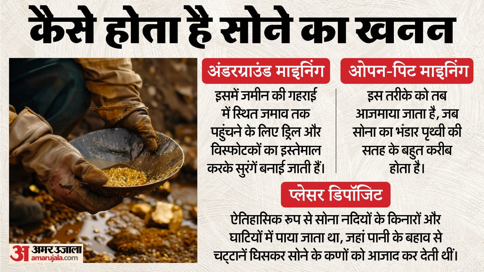 - सोना मुख्य रूप से कठोर चट्टानी भंडारों और प्लेसर डिपॉजिट यानी नदी के किनारों या घाटियों में जमा खानों से निकाला जाता है। हालांकि, इसे निकालने की प्रक्रियाएं काफी जटिल हैं।