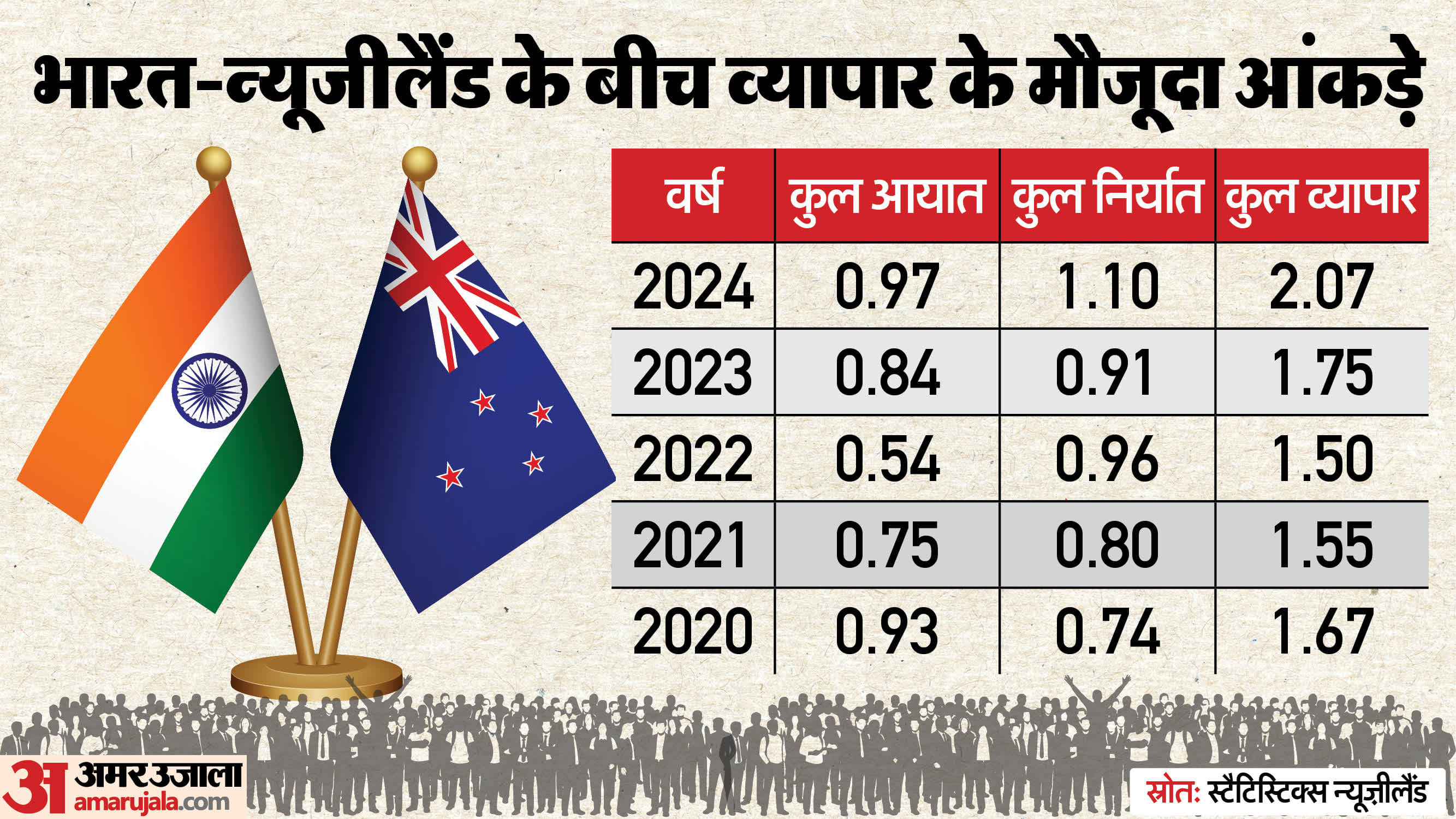 भारत और न्यूजीलैंड के बीच व्यापार काफी स्थिर गति से बढ़ा है। बीते पांच साल के डाटा पर नजर डाली जाए तो सामने आता है कि वित्त वर्ष 2020 में दोनों देशों के बीच 1.67 अरब डॉलर का द्विपक्षीय व्यापार हुआ था। हालांकि, कोरोना महामारी के प्रभाव के चलते अगले दो वित्त वर्ष 2021, 2022 में दोनों देशों का व्यापार कम हुआ।भारत-न्यूजीलैंड के बीच द्विपक्षीय व्यापार ने 2023 में फिर रफ्तार पकड़ी। 2024 में यह आंकड़ा पहली बार दो अरब डॉलर के आंकड़े को पार कर गया। जून 2025 में समाप्त हुए वर्ष में भारत-न्यूजीलैंड के बीच वस्तुओं और सेवाओं का कुल व्यापार लगभग डेढ़ गुना से ज्यादा होते हुए 3.68 अरब डॉलर पहुंच गया था। इसके बावजूद भारत अब तक न्यूजीलैंड के लिए 12वां सबसे बड़ा निर्यात बाजार है। न्यूजीलैंड अपने कुल निर्यात का 1.5 फीसदी ही भारत को भेजता है।