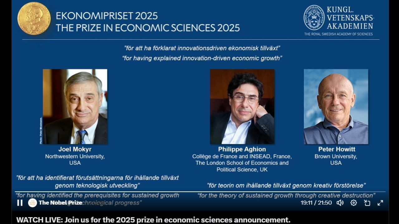 रॉयल स्वीडिश एकेडमी ऑफ साइंसेज ने अल्फ्रेड नोबेल की स्मृति में आर्थिक विज्ञान में 2025 का स्वेरिग्स रिक्सबैंक पुरस्कार यानी अर्थशास्त्र के नोबेल पुरस्कार का एलान कर दिया है। इस वर्ष यह पुरस्कार जोएल मोकिर, फिलिप अघियन और पीटर हॉविट को 'नवाचार-संचालित आर्थिक विकास की व्याख्या करने के लिए' दिया गया है। पुरस्कार का आधा हिस्सा मोकिर को 'तकनीकी प्रगति के माध्यम से सतत विकास के लिए आवश्यक शर्तों की पहचान करने के लिए' और शेष आधा हिस्सा अघियन और हॉविट को 'रचनात्मक विनाश के माध्यम से सतत विकास के सिद्धांत के लिए' संयुक्त रूप से दिया जाएगा।