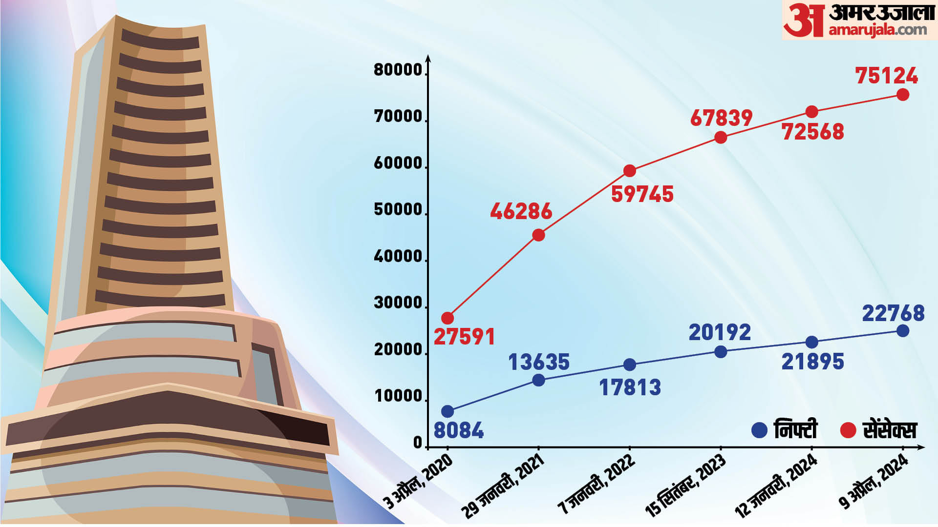 2020 से 2024 के बीच सेंसेक्स -निफ्टी का हाल।