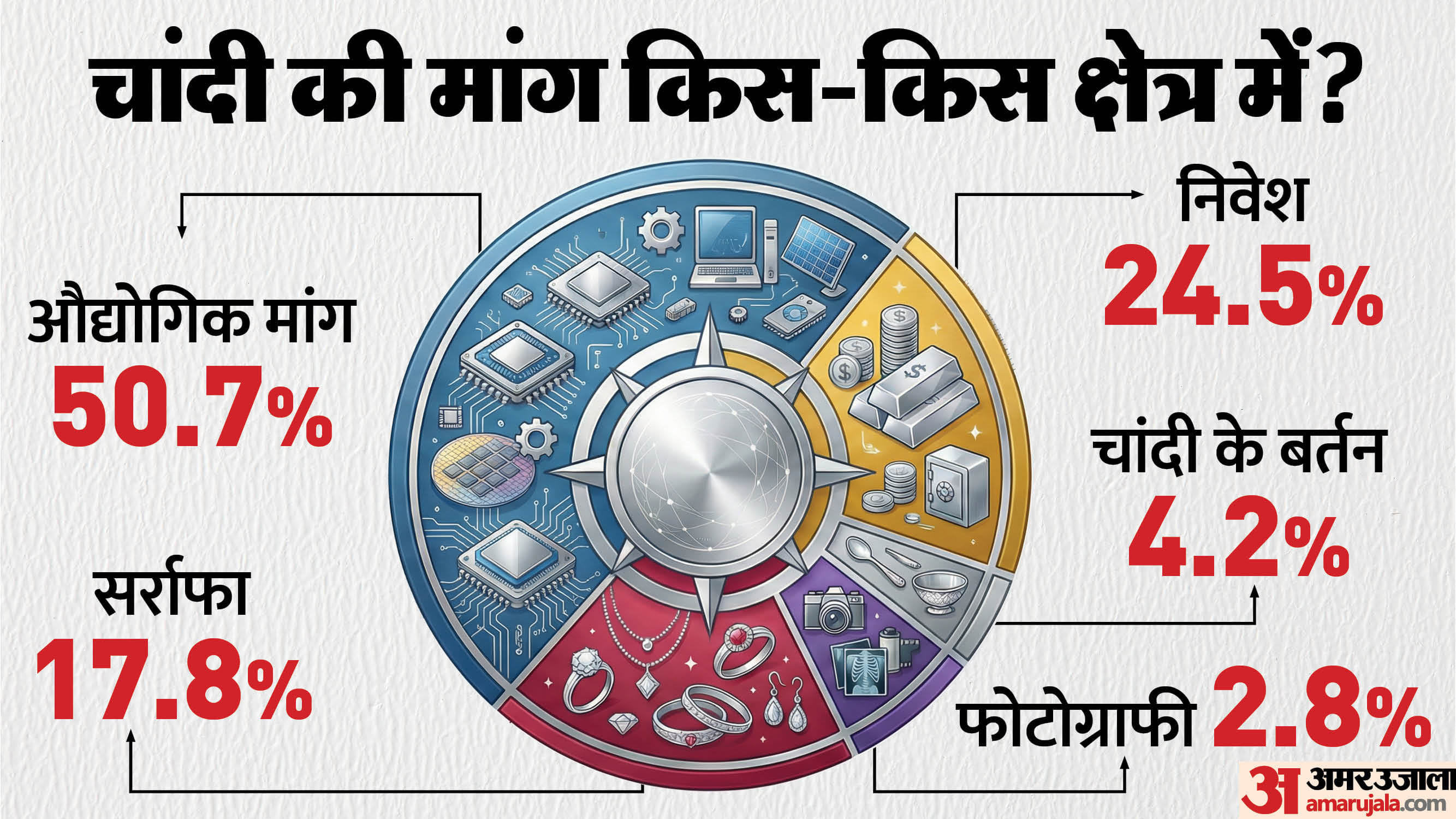 आर्टिफिशियल इंटेलिजेंस और तकनीक: एआई से जुड़े उद्योगों में चांदी की मांग तेजी से बढ़ रही है। इसका इस्तेमाल स्मार्ट ग्रिड इंफ्रास्ट्रक्चर और डेटा ट्रांसमिशन से जुड़े उपकरणों में किया जाता है। टेस्ला के प्रमुख एलन मस्क ने भी कहा है कि चांदी कई औद्योगिक प्रक्रियाओं के लिए बेहद जरूरी है।