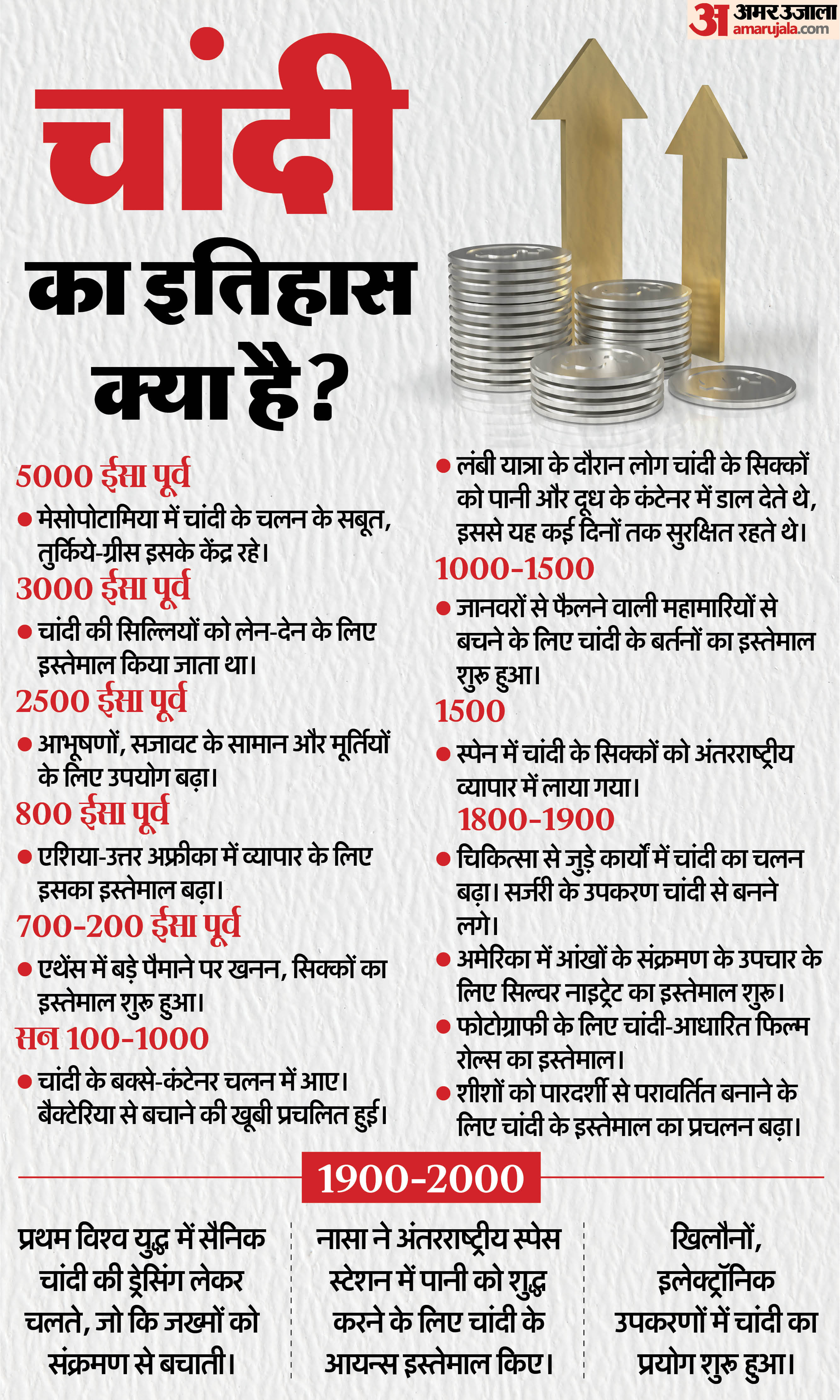 चांदी की कीमतों में रिकॉर्डतोड़ बढ़त के बीच यह जानना अहम है कि आखिर इस धातु का इतिहास क्या है? यह इतनी अहमियत क्यों रखती है और इसकी कीमत सोने से कम क्यों है? इसकी बढ़ती कीमतों का इतिहास क्या है? हालिया दिनों में चांदी के भाव किस तेजी से बढ़े हैं और इसकी वजह क्या रही? आइये जानते हैं...