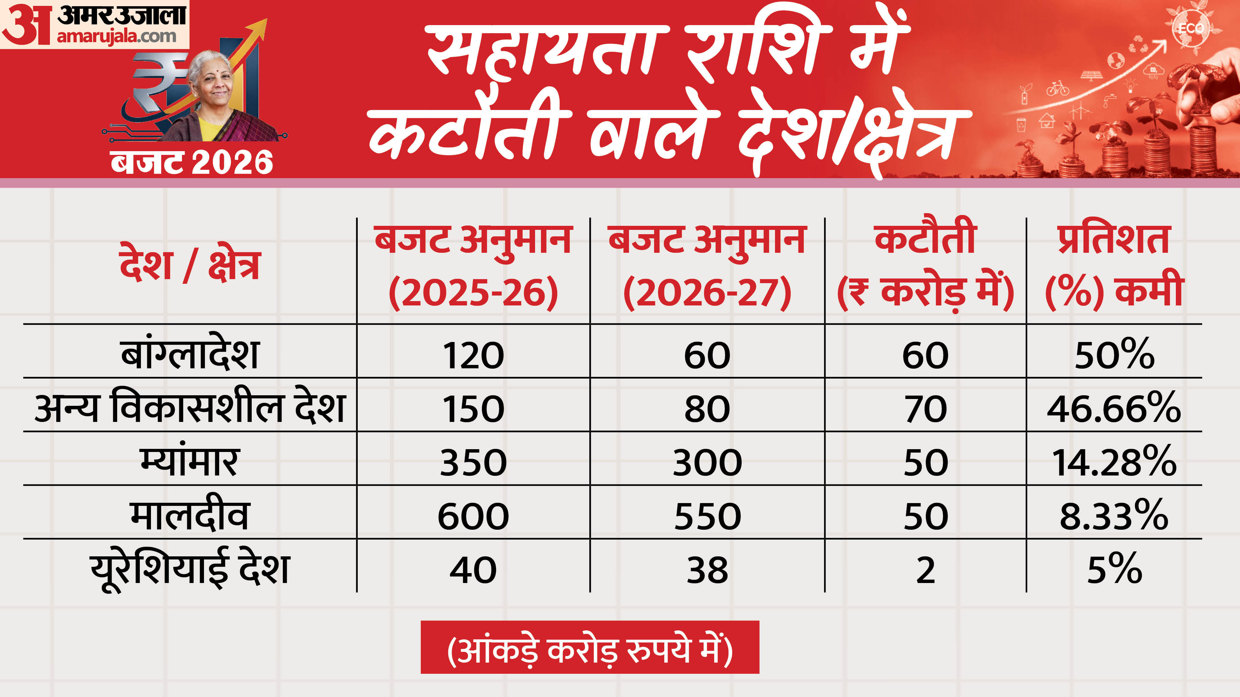 बजट में किन देशों की मदद घटाई गई?