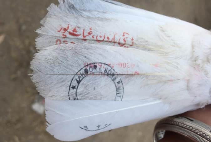 बहरामपुर थाने के गांव खुदादपुर के सरपंच संदीप सिंह गुरुवार देर शाम अपनी हवेली में काम कर रहे थे। वहां अचानक एक सफेद कबूतर दिखा। उन्होंने किसी तरह कबूतर को पकड़ लिया। कबूतर की जांच करने पर उसके पंखों पर लाल रंग की उर्दू और काले रंग की अंग्रेजी में मोहर लगी है। पंखों पर एक नंबर छपा है।