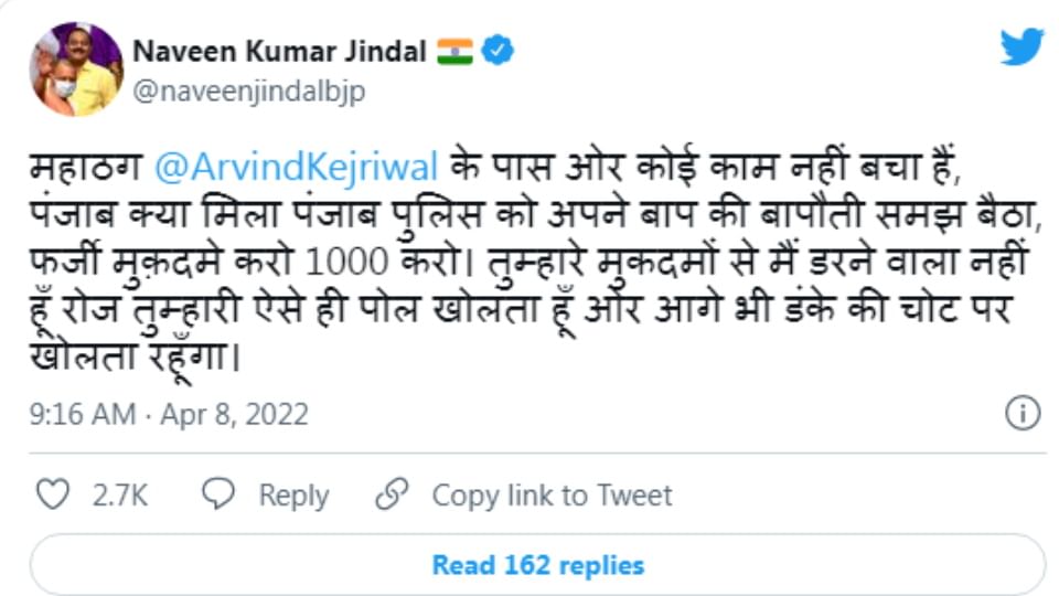 जिंदल ने यह वीडियो छह अप्रैल को ट्विटर पर साझा किया था। जिंदल पर भारतीय दंड संहिता (आईपीसी) अधिनियम 1860 की धारा 465, 469, 471, 500, 504, 505 (1) (बी) और सूचना प्रौद्योगिकी अधिनियम, 2000 की धारा 66 के तहत मामला दर्ज किया गया है। वहीं जिंदल ने पंजाब पुलिस का दुरुपयोग करने के लिए केजरीवाल को फटकार लगाई। एफआईआर होने के बाद जिंदल ने ट्वीट कर कहा कि "ठग अरविंद केजरीवाल के पास और काम नहीं बचा। पंजाब को क्या मिला? पंजाब पुलिस का दुरुपयोग कर रहा है। जितनी एफआईआर करना है, करो। मैं आपके मामलों से नहीं डरूंगा, मैं हर दिन आपका चेहरा ऐसे ही प्रकट करूंगा और ऐसा करना जारी रखूंगा"