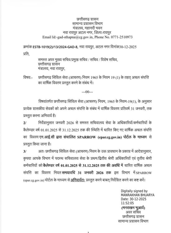 छत्तीसगढ़ सरकार ने सभी अधिकारियों और कर्मचारियों को अपनी अचल संपत्तियों का वार्षिक ब्योरा तय समय सीमा के भीतर प्रस्तुत करने के निर्देश जारी किए हैं। सामान्य प्रशासन विभाग ने इस संबंध में अपर मुख्य सचिव, प्रमुख सचिव, सचिव और विशेष सचिवों को पत्र भेजकर स्पष्ट कर दिया है कि 31 जनवरी तक वार्षिक संपत्ति विवरण जमा करना अनिवार्य होगा।