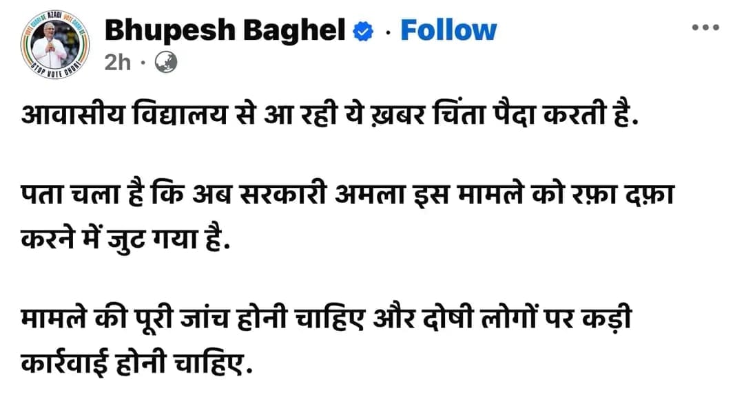 मामले में प्रदेश के पूर्व सीएम भूपेश बघेल ने शासन-प्रशासन पर गंभीर सवाल उठाये हैं। उन्होंने अपने सोशल मीडिया हैंडल पर लिखा कि आवासीय विद्यालय से आ रही ये खबर चिंता पैदा करती है। पता चला है कि अब सरकारी अमला इस मामले को रफा-दफा करने में जुटा है। मामले की पूरी जांच होनी चाहिए और दोषी लोगों पर कड़ी कार्रवाई होनी चाहिए।