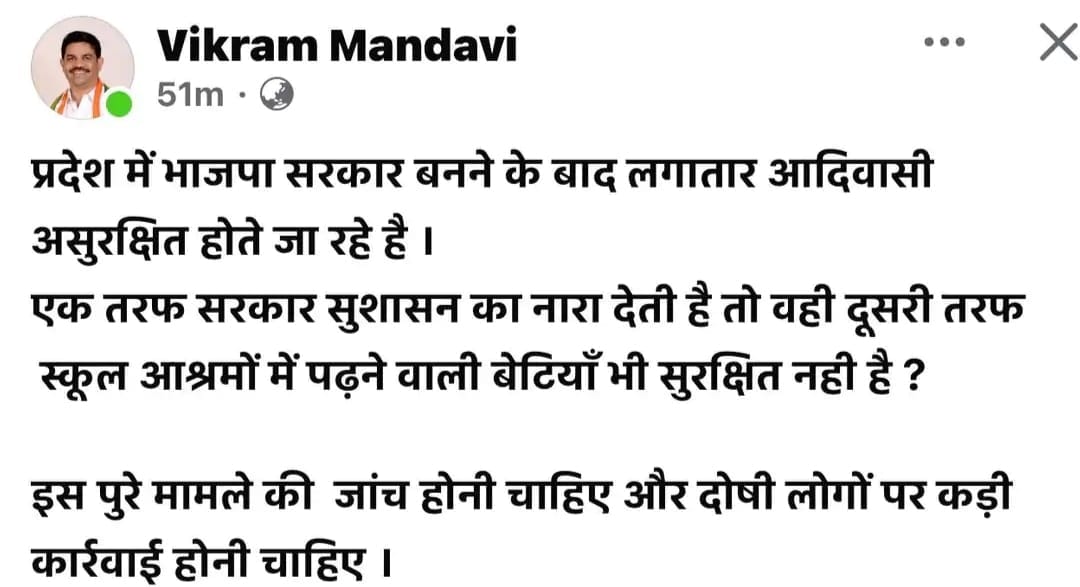 वहीं बीजापुर कांग्रेस विधायक विक्रम मंडावी ने भी अपने सोशल मीडिया हैंडल पर लिखा कि प्रदेश में भाजपा की सरकार बनने के बाद लगातार आधिवासी असुरक्षित होते जा रहे हैं। एक तरफ सरकार सुशासन का नारा देती है, तो वहीं दूसरी तरफ स्कूल आश्रमों में पढ़ने वाली बेटियां भी सुरक्षित नहीं हैं। इस पूरे मामले की जांच होनी चाहिये और दोषी लोगों पर कड़ी कार्रवाई होनी चाहिये।