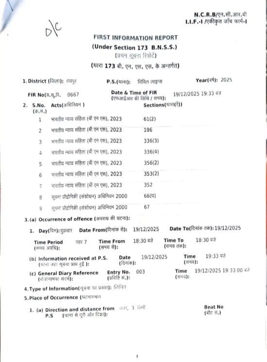 विधायक ने इसे बीजेपी के शीर्ष नेतृत्व और छत्तीसगढ़ सरकार के वरिष्ठ नेताओं को बदनाम करने की सुनियोजित राजनीतिक साजिश करार देते हुए रायपुर पुलिस अधीक्षक से लिखित शिकायत की है। विधायक ने वीडियो को पूरी तरह से भ्रामक, असत्य और दुर्भावनापूर्ण बताते हुए भारतीय न्याय संहिता (बीएनएस) 2023 और सूचना प्रौद्योगिकी अधिनियम के तहत कठोर धाराओं में तत्काल एफआईआर दर्ज करने की मांग की है।