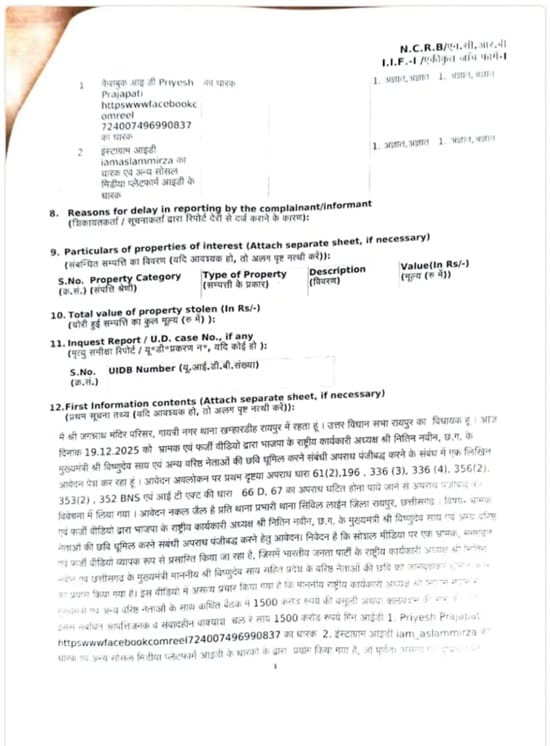 शिकायत में विधायक पुरंदर मिश्रा ने कहा है कि सोशल मीडिया के विभिन्न प्लेटफॉर्मों पर जानबूझकर एक ऐसा वीडियो वायरल किया जा रहा है, जिसका वास्तविकता से कोई संबंध नहीं है। इस फर्जी वीडियो में भाजपा के राष्ट्रीय अध्यक्ष नितिन नवीन और छत्तीसगढ़ के मुख्यमंत्री विष्णुदेव साय सहित कई वरिष्ठ नेताओं पर 1500 करोड़ रुपये की कथित ‘वसूली’ या ‘कलेक्शन’ का झूठा आरोप मढ़ा गया है। वीडियो में आपत्तिजनक और अमर्यादित वाक्य का प्रयोग कर न केवल नेताओं की गरिमा को ठेस पहुंचाने बल्कि जनता को गुमराह करने का प्रयास किया गया है।