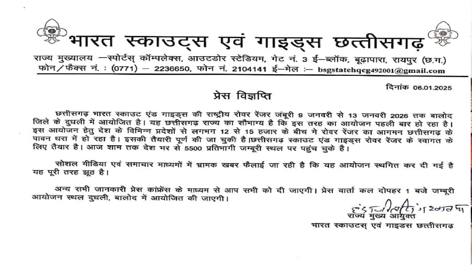 आयोजन से संबंधित अन्य विस्तृत जानकारी प्रेस कॉन्फ्रेंस के माध्यम से प्रदान की जाएगी। सात जनवरी को दोपहर एक बजे जंबूरी आयोजन स्थल दुधली जिला बालोद में प्रेस वार्ता ली जायेगी।