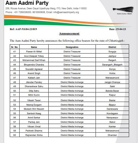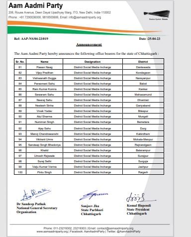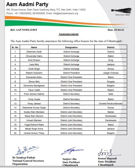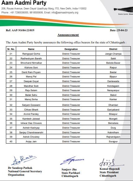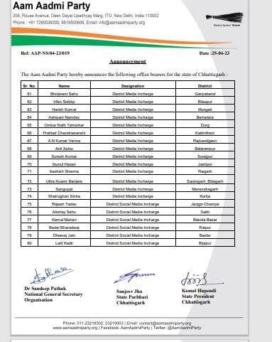 छत्तीसगढ़ आप का पुनर्गठन: इन नेताओं को मिली अहम जिम्मेदारी, प्रदेश प्रभारी संजीव झा ने की घोषणा, देखें सूची