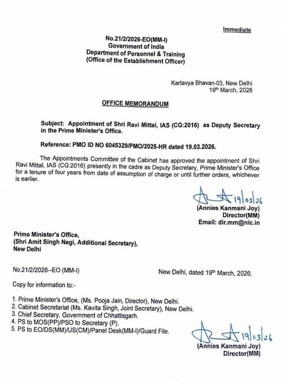 छत्तीसगढ़: आईएएस रवि मित्तल को पीएमओ में मिली अहम जिम्मेदारी, बनाए गए डिप्टी सेक्रेटरी