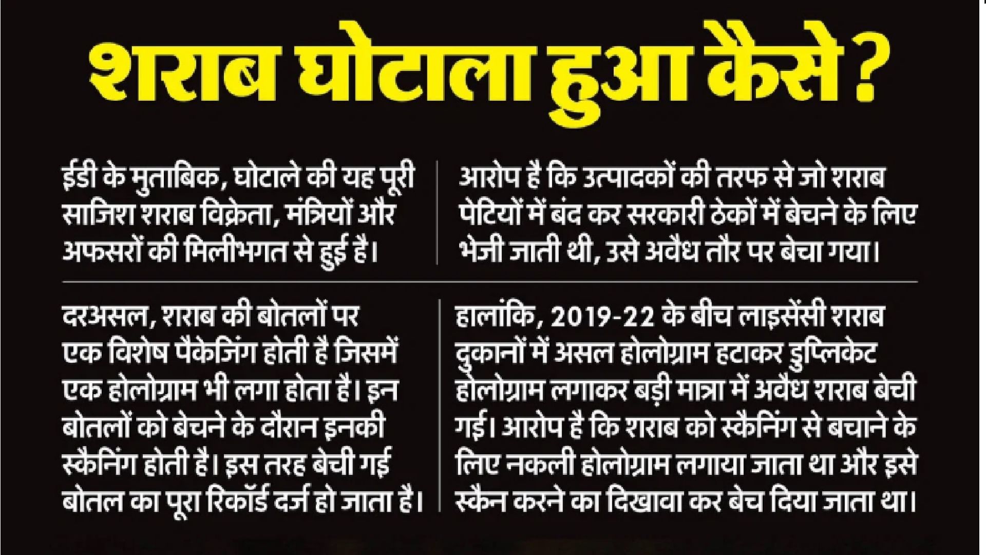 ईडी के मुताबिक, छत्तीसगढ़ में भूपेश सरकार के कार्यकाल के दौरान वर्ष 2019-2022 तक लाइसेंसी शराब दुकानों में डुप्लिकेट होलोग्राम लगाकर बड़ी मात्रा में अवैध शराब बेची गई थी। इस वजह से छत्तीसगढ़ के राजस्व विभाग को करोड़ों रुपये का नुकसान हुआ था। शराब को स्कैनिंग से बचाने के लिए नकली होलोग्राम भी लगाया जाता था, जिससे वह किसी की पकड़ में न आ सके। घोटाले में संलिप्त लोगों ने इस होलोग्राम को बनाने के लिए उत्तर प्रदेश के नोएडा में होलोग्राफी का काम करने वाली प्रिज्म होलोग्राफी सिक्योरिटी फिल्म्स प्राइवेट लिमिटेड कंपनी को टेंडर दिया था। यह कंपनी होलोग्राम बनाने के लिए पात्र नहीं थी, फिर भी नियमों में संशोधन करके यह टेंडर कंपनी को दे दिया गया था।