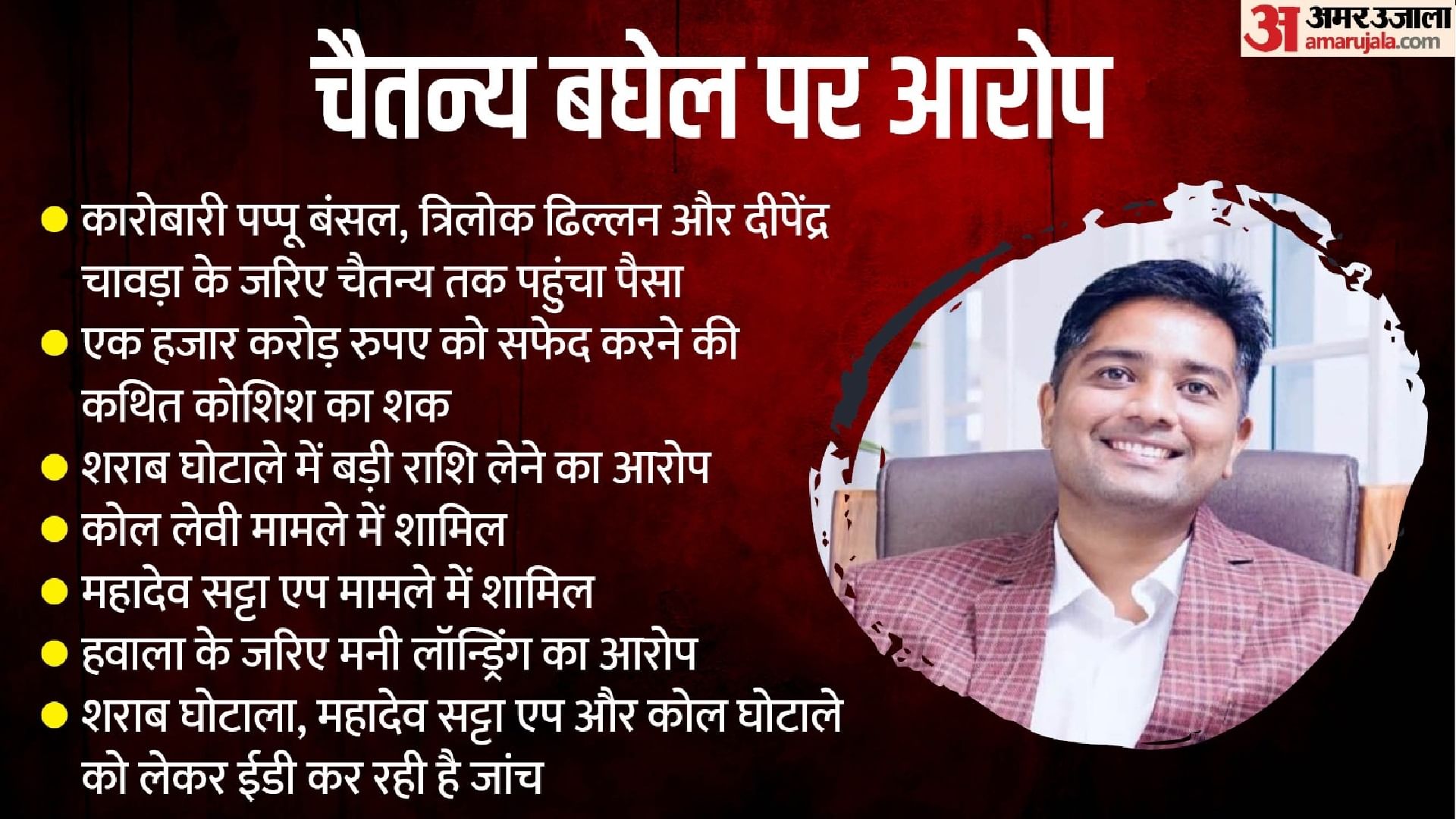 चैतन्य बघेल को धन शोधन रोधी अधिनियम की धारा 19 के तहत गिरफ्तार किया गया है। सूत्रों के मुताबिक, नए सबूत मिलने के बाद की गई छापेमारी के दौरान चैतन्य कथिततौर पर सहयोग नहीं कर रहे थे। चैतन्य बघेल से कथित रूप से जुड़ी कंपनियों को कथित शराब घोटाले से अर्जित लगभग 17 करोड़ रुपये की 'अपराध आय' प्राप्त हुई है। करीब 1,070 करोड़ रुपये की धनराशि के साथ ही उनकी भूमिका एजेंसी की जांच के दायरे में है।