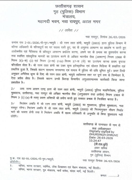 छत्तीसगढ़ में पुलिस विभाग के एक वरिष्ठ अधिकारी पर बड़ी कार्रवाई करते हुए राज्य सरकार ने आईजी रतन लाल डांगी को निलंबित कर दिया है। यह निर्णय उनके आपत्तिजनक फोटो के सोशल मीडिया पर वायरल होने के बाद लिया गया, जिससे विभाग की छवि पर प्रतिकूल प्रभाव पड़ा।