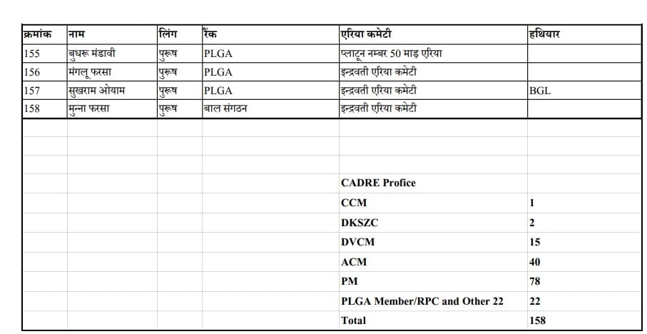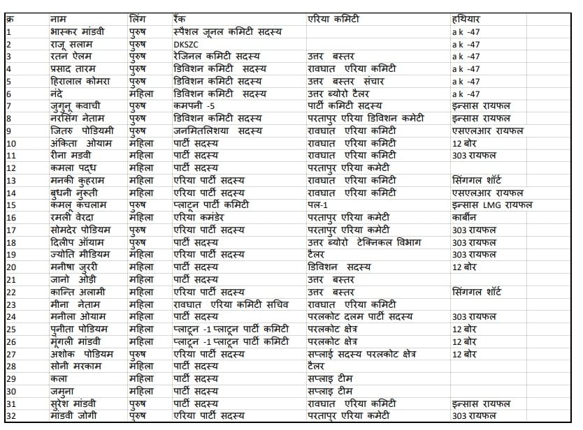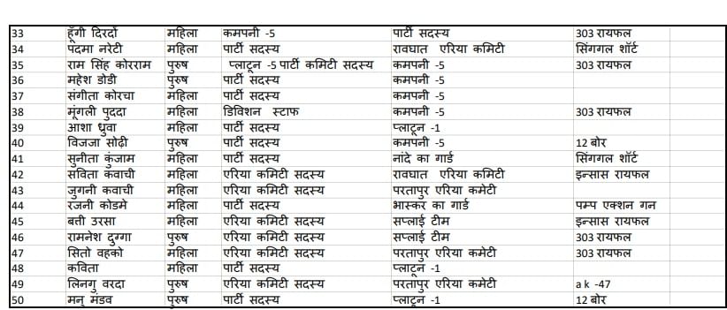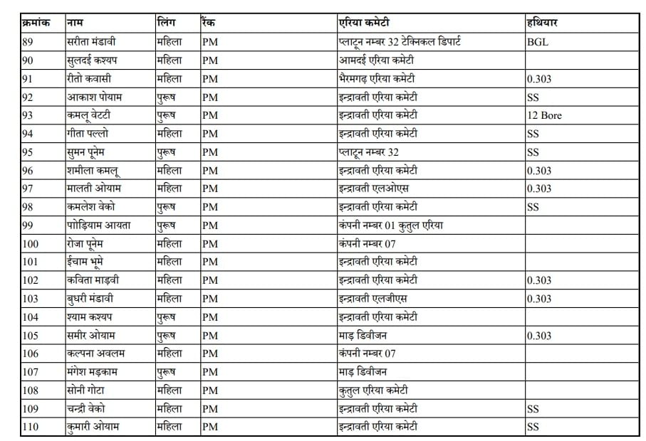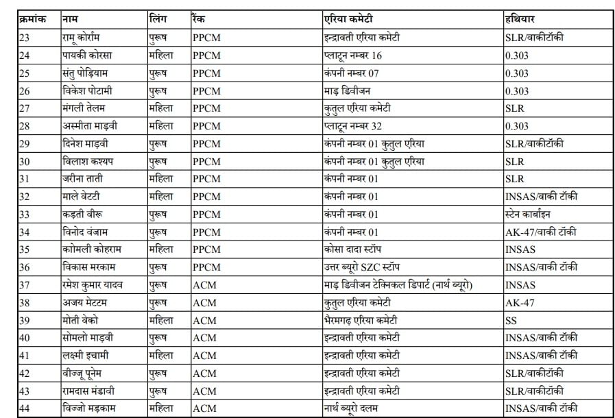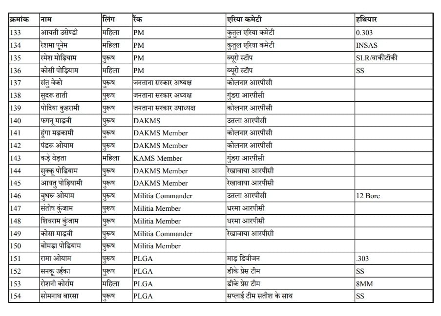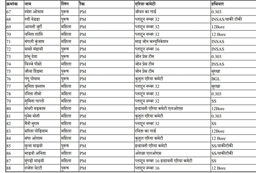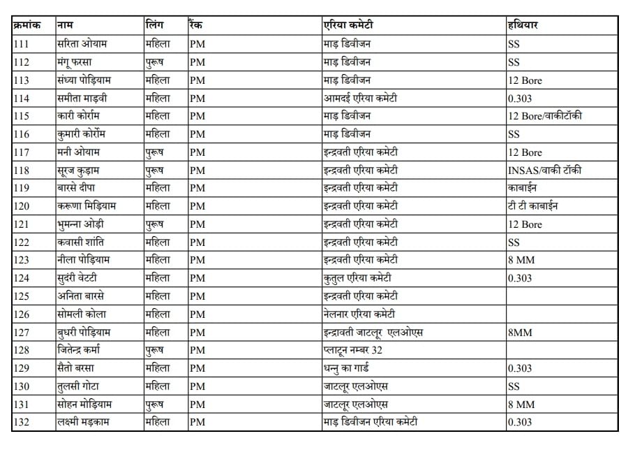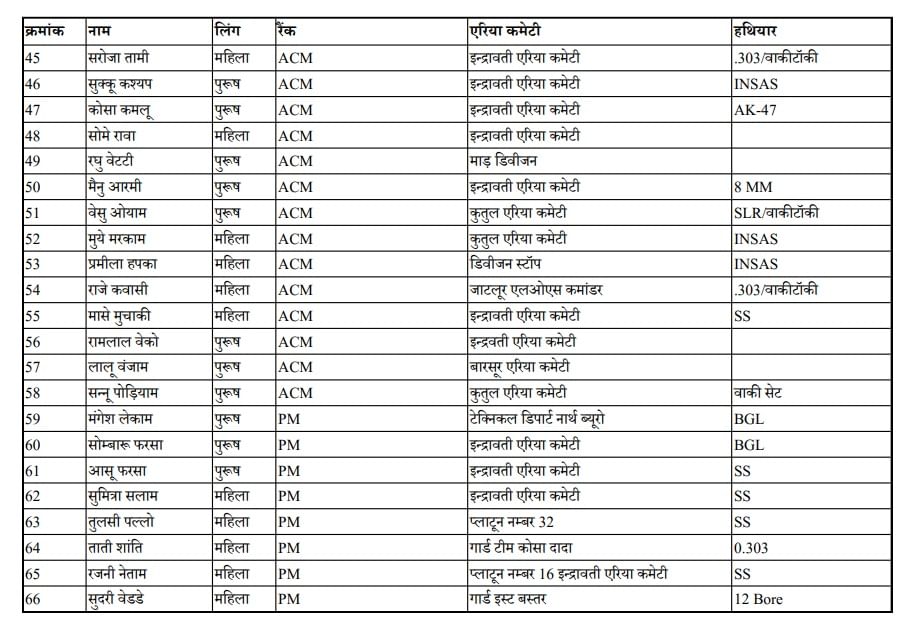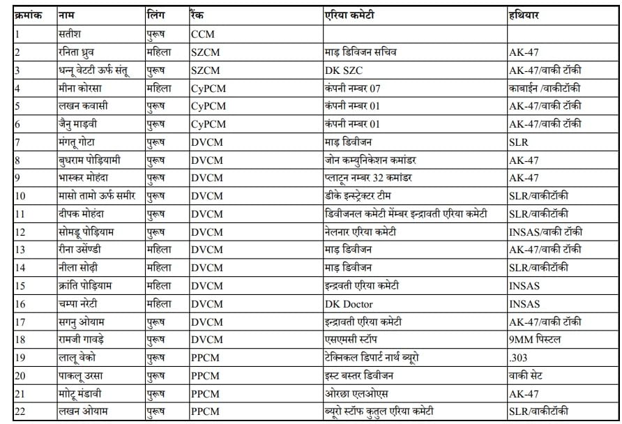 समर्पण करने वाले नक्सलियों के नाम व पद
