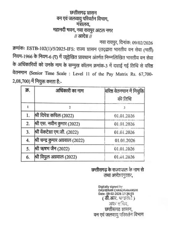 छत्तीसगढ़ सरकार ने वन विभाग के प्रशासनिक ढांचे को सुदृढ़ करने के उद्देश्य से भारतीय वन सेवा के अधिकारियों को लेकर अहम निर्णय लिया है। राज्य शासन की ओर से जारी आदेश के तहत विभाग में स्थानांतरण और पदोन्नति से जुड़े फैसलों को अमल में लाया गया है। सरकारी आदेश के अनुसार दो भारतीय वन सेवा अधिकारियों का स्थानांतरण किया गया है, जबकि पांच अधिकारियों को वरिष्ठ वेतनमान का लाभ दिया गया है।