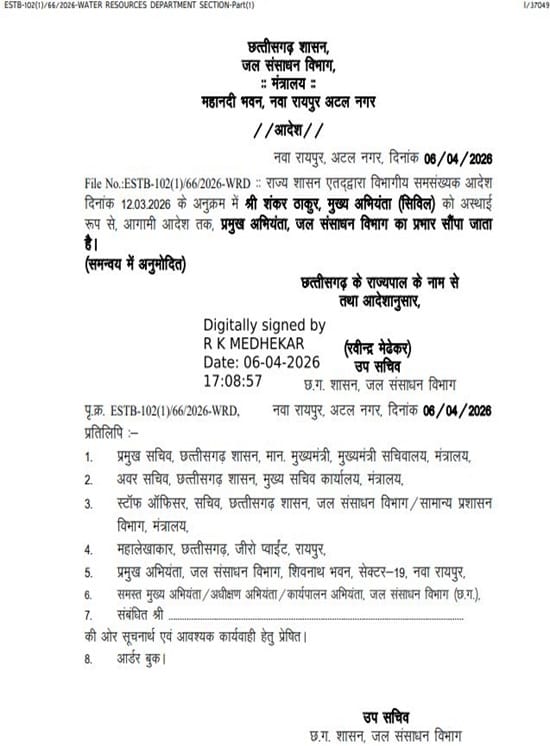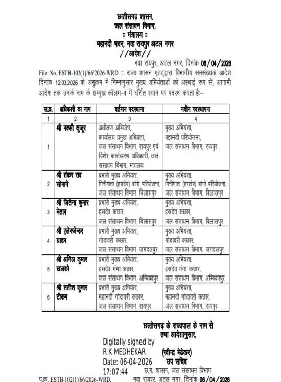 छत्तीसगढ़: जल संसाधन विभाग में बड़ा बदलाव, कई अधिकारियों को मिली नई जिम्मेदारी