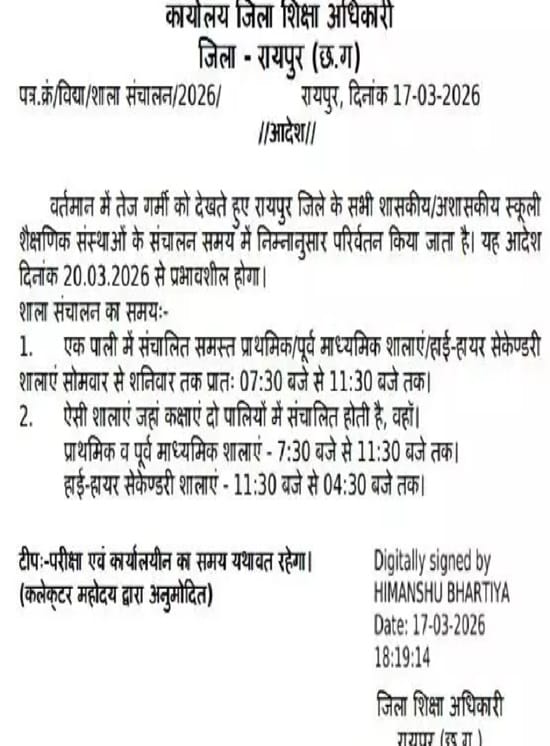 राजधानी रायपुर में लगातार बढ़ती गर्मी को देखते हुए जिला प्रशासन ने स्कूली समय में बदलाव का निर्णय लिया है। जिला शिक्षा अधिकारी द्वारा जारी आदेश के अनुसार 20 मार्च से सभी स्कूल नए समय के अनुसार संचालित होंगे।