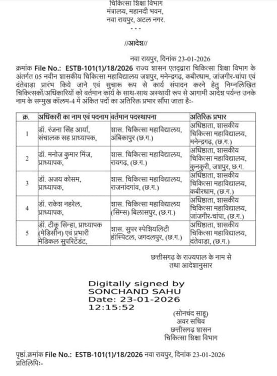 छत्तीसगढ़ सरकार ने राज्य में हाल ही में शुरू हुए पांच नए मेडिकल कॉलेजों में डीन की नियुक्ति कर दी है। चिकित्सा शिक्षा विभाग ने इस संबंध में आधिकारिक आदेश जारी कर दिया है।