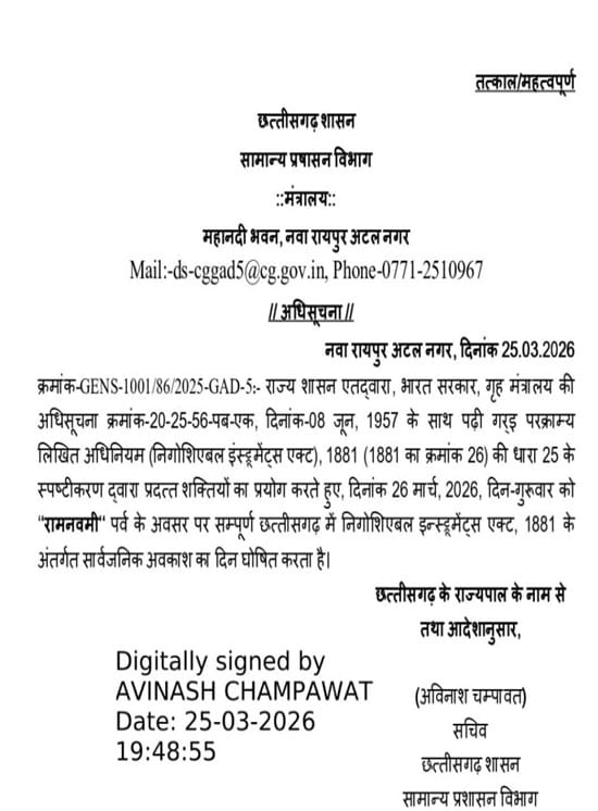 सामान्य प्रशासन विभाग छत्तीसगढ़ द्वारा जारी आदेश के अनुसार यह अवकाश परक्राम्य लिखत अधिनियम 1881 के प्रावधानों के तहत घोषित किया गया है, जिससे बैंकिंग संस्थान भी इस दिन बंद रहेंगे।