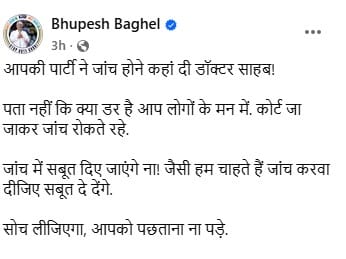 इस पर भूपेश बघेल ने फिर पलटवार करते हुए जवाब दिया कि 'आपकी पार्टी ने जांच होने कहां दी डॉक्टर साहब!पता नहीं कि क्या डर है आप लोगों के मन में। कोर्ट जा जाकर जांच रोकते रहे। जांच में सबूत दिए जाएंगे ना! जैसी हम चाहते हैं जांच करवा दीजिए सबूत दे देंगे। सोच लीजिएगा, आपको पछताना ना पड़े।