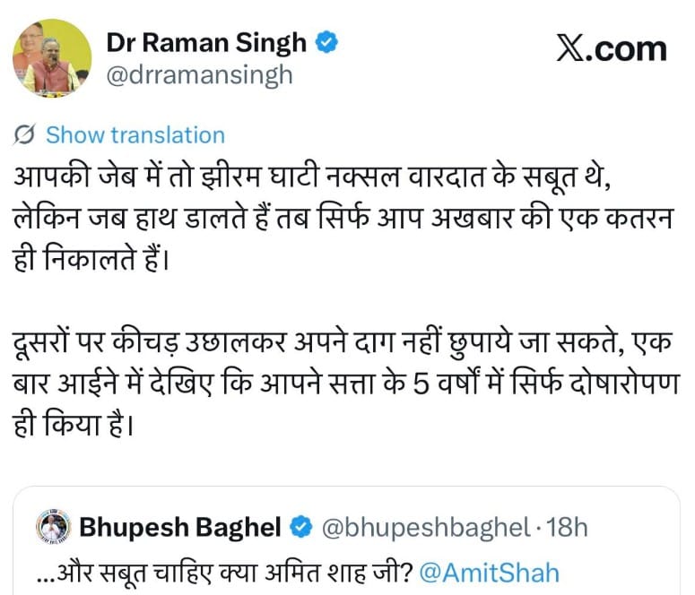 रमन सिंह ने पलटवार करते हुए कहा कि “दूसरों पर कीचड़ उछालकर अपने दाग नहीं छुपाए जा सकते।”। तंज कसते हुए उन्होंने कहा कि “झीरम घाटी नक्सल वारदात के सबूत आपकी जेब में थे, लेकिन अब सिर्फ अखबार की कतरन ही दिखाई जा रही है।” आईना देखने की नसीहत देते हुए सिंह ने कहा कि उनके पांच साल के कार्यकाल में केवल आरोप-प्रत्यारोप की राजनीति हुई और ठोस कार्रवाई नहीं दिखी।