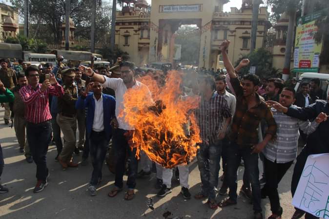 बीएचयू के छात्रों ने जेएनयू की प्रोफेसर का पुतला फूंका