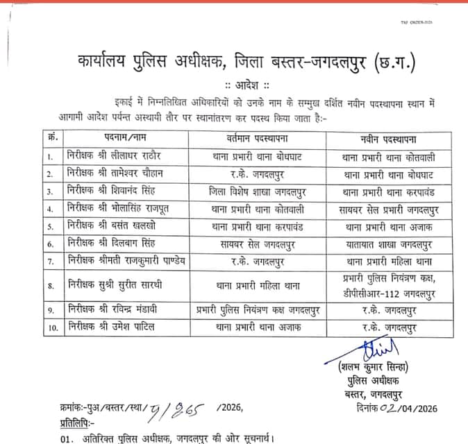 Jagdalpur: बस्तर पुलिस अधीक्षक ने 10 निरीक्षकों का किया स्थानांतरण, लीलाधर राठौर बने कोतवाली प्रभारी